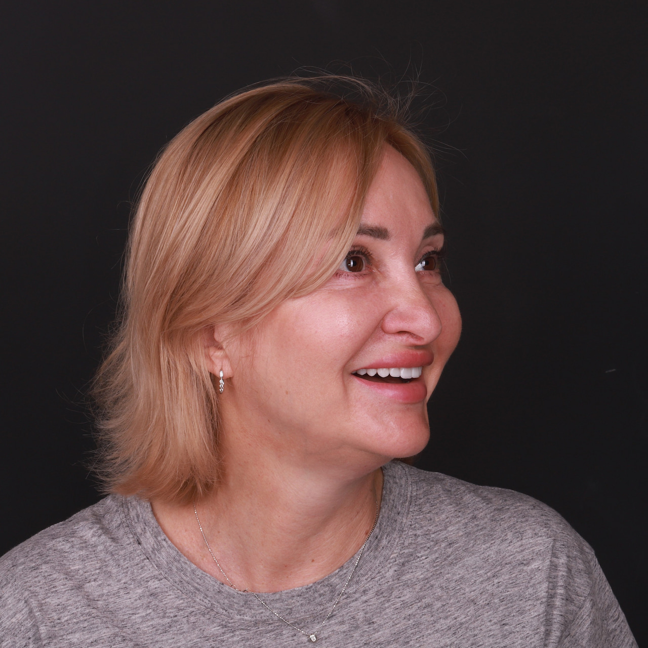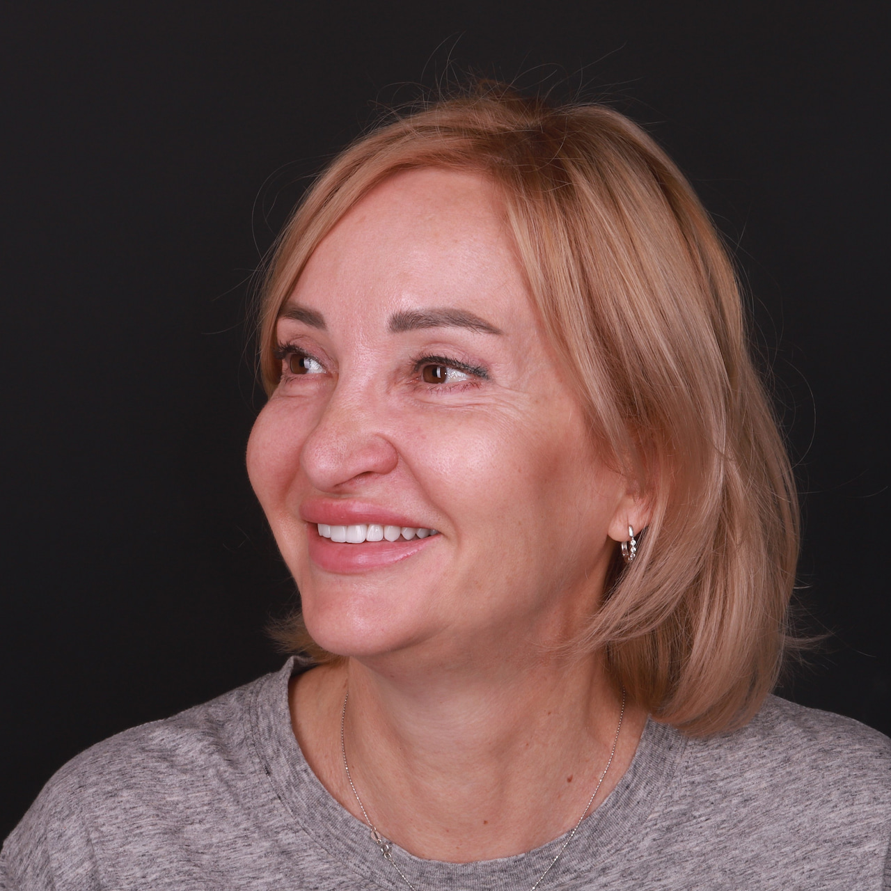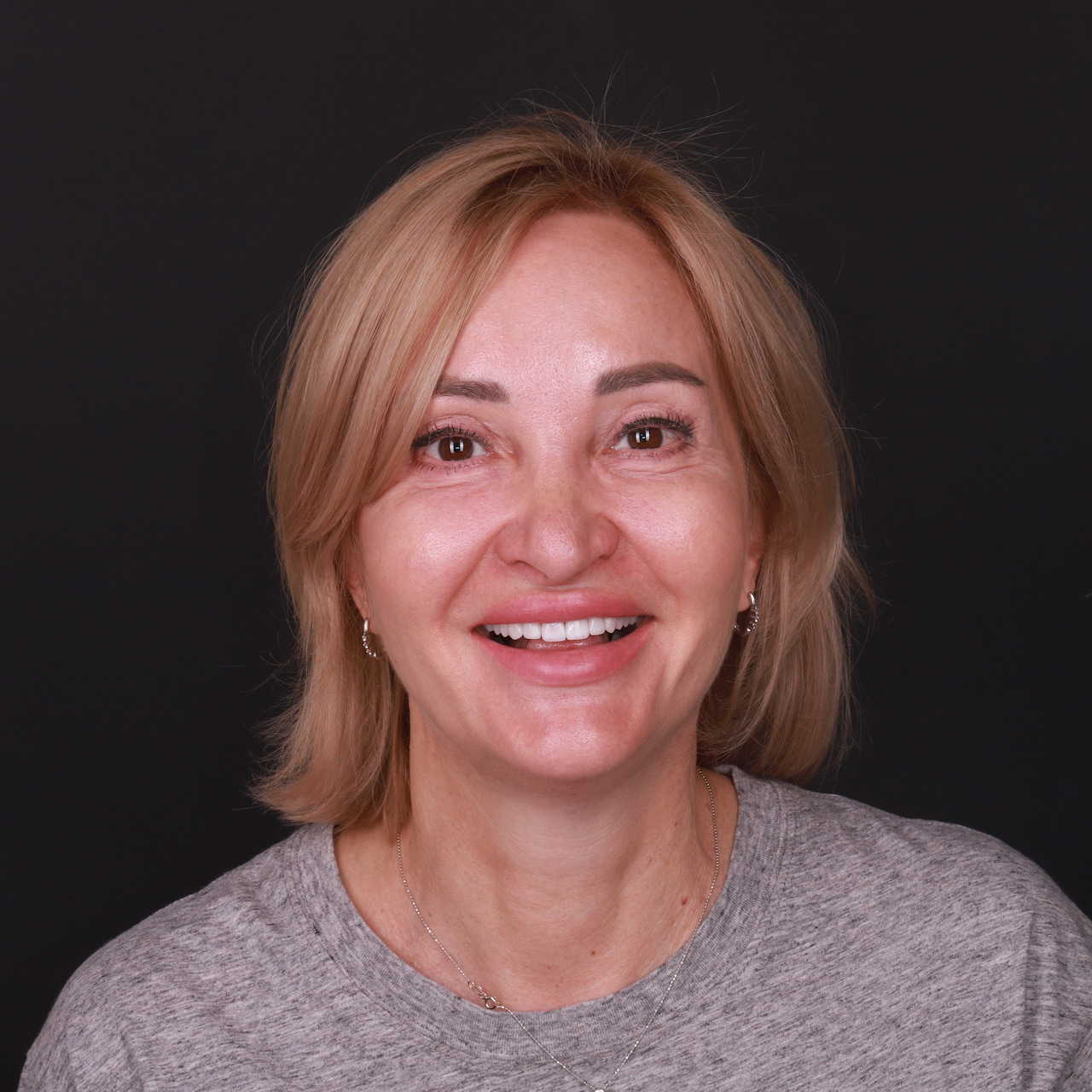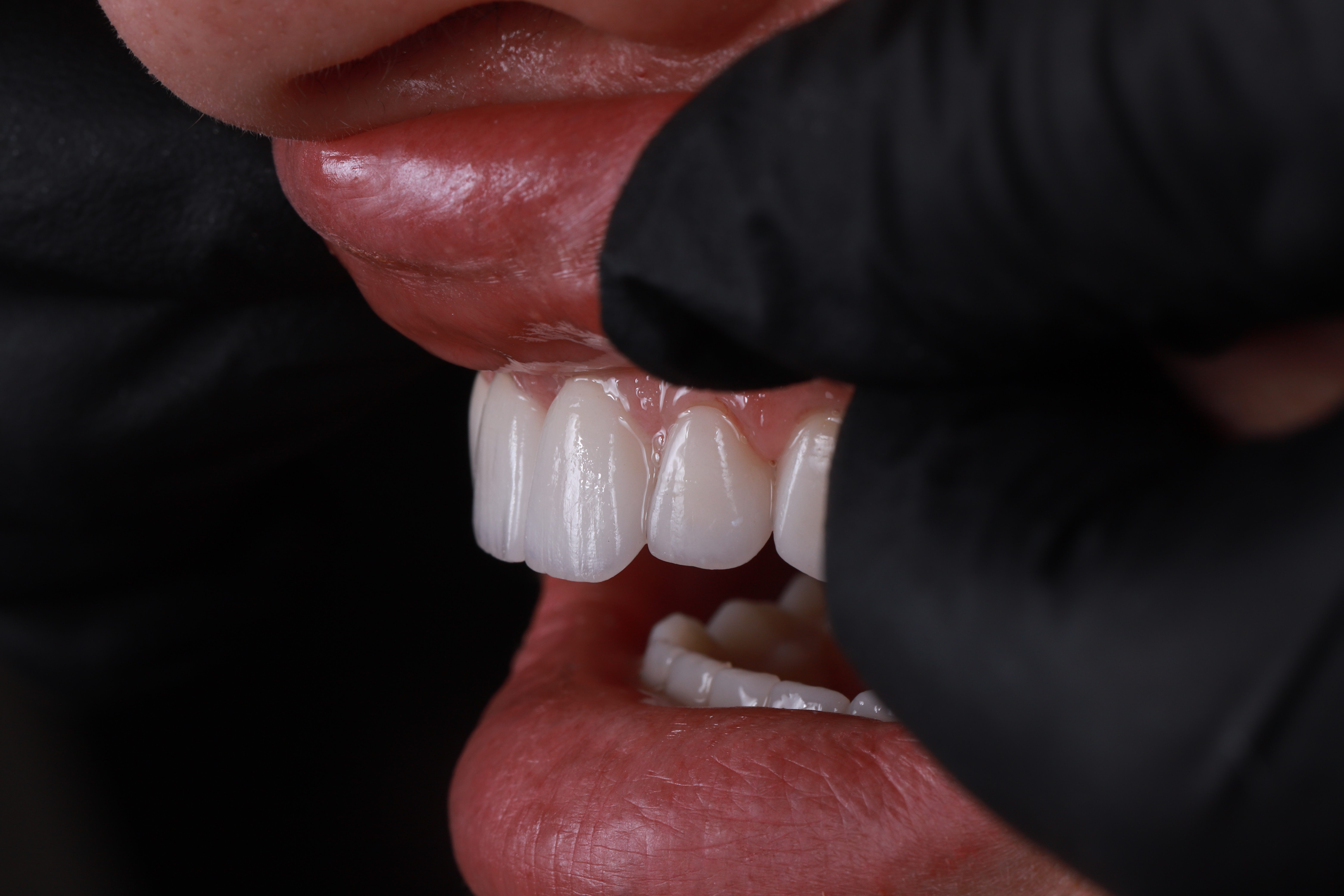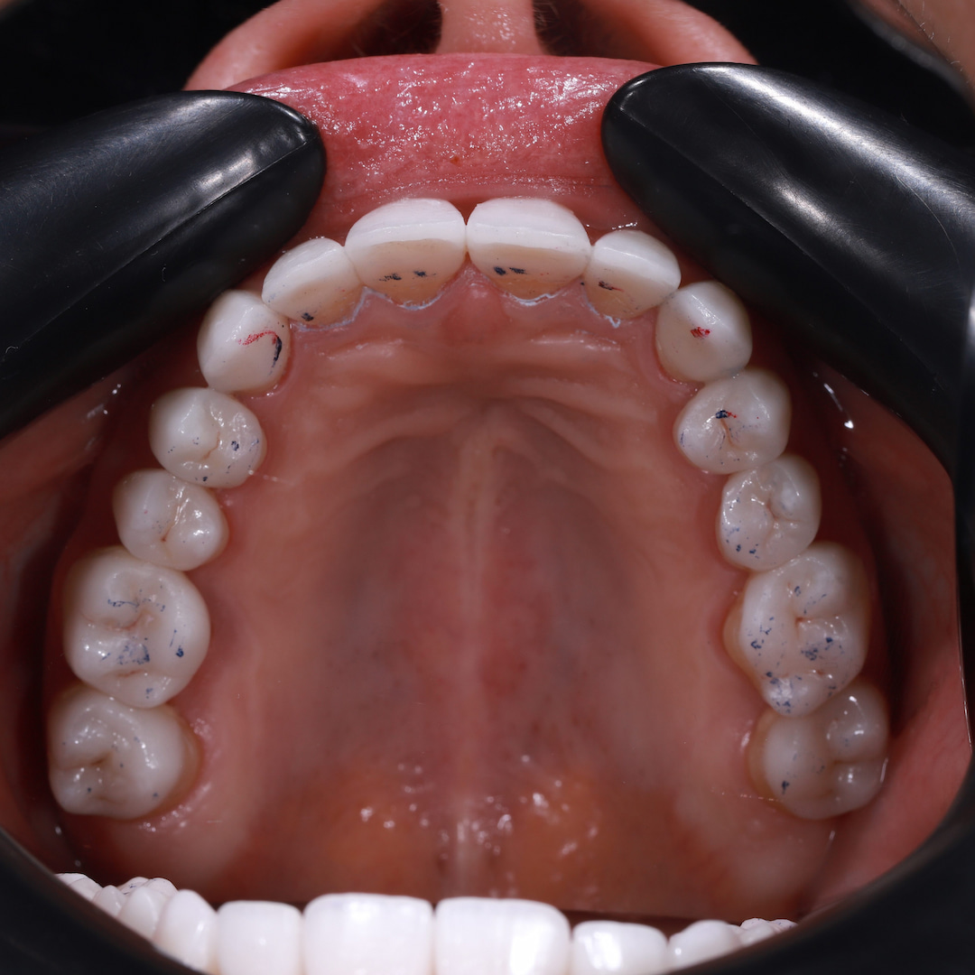 На завершальному етапі, вже після фіксації вінірів, до роботи долучився гнатолог. Ми провели ретельну перевірку та корекцію оклюзії (змикання зубів). Це критично важливий крок, який забезпечує правильну роботу суглобів, відсутність перевантажень на кераміку та гарантує комфорт пацієнтки під час жування.