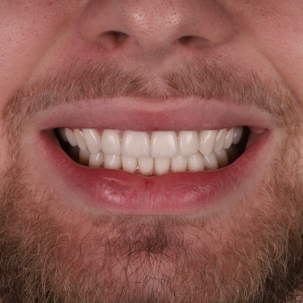 Завершальним етапом стало встановлення 28 керамічних реставрацій, включаючи коронку на новому імплантаті. Ми досягли повної інтеграції конструкцій за кольором і формою, створивши природну посмішку, де центральний зубець більше нічим не відрізняється від сусідніх.
